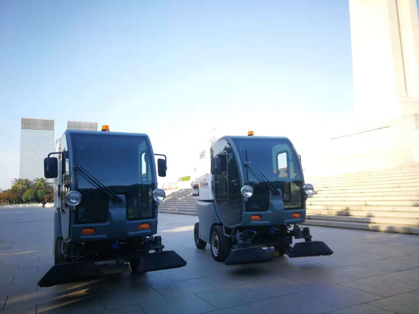 新交付的这批电动扫地车采用全封闭纯吸式清扫作业,在积水路面可正常清扫作业,采用两道洒水降尘和两道过滤除尘,降低了扬尘。垃圾倾倒方式为液压倾倒方式,降低了驾驶人员的工作量,一次充满电可以作业75公里,垃圾箱容量达到450L,净水箱容量在270L,充分考虑了作业现场的环卫需求。同时在电动扫地车的功能上,不仅仅具有清扫功能,也配置了高压清洗装置,能够针对环卫作业现场的一些需求来进行灵活的运用,在尾部还配置了吸尘管,针对花坛、绿化带不容易清扫的地方可以手持吸尘吸垃圾,非常的人性化、细致化。