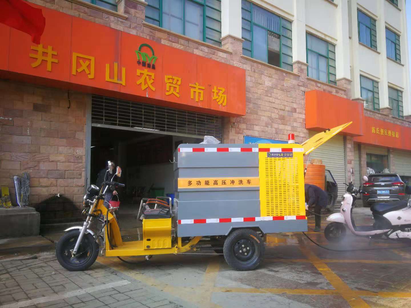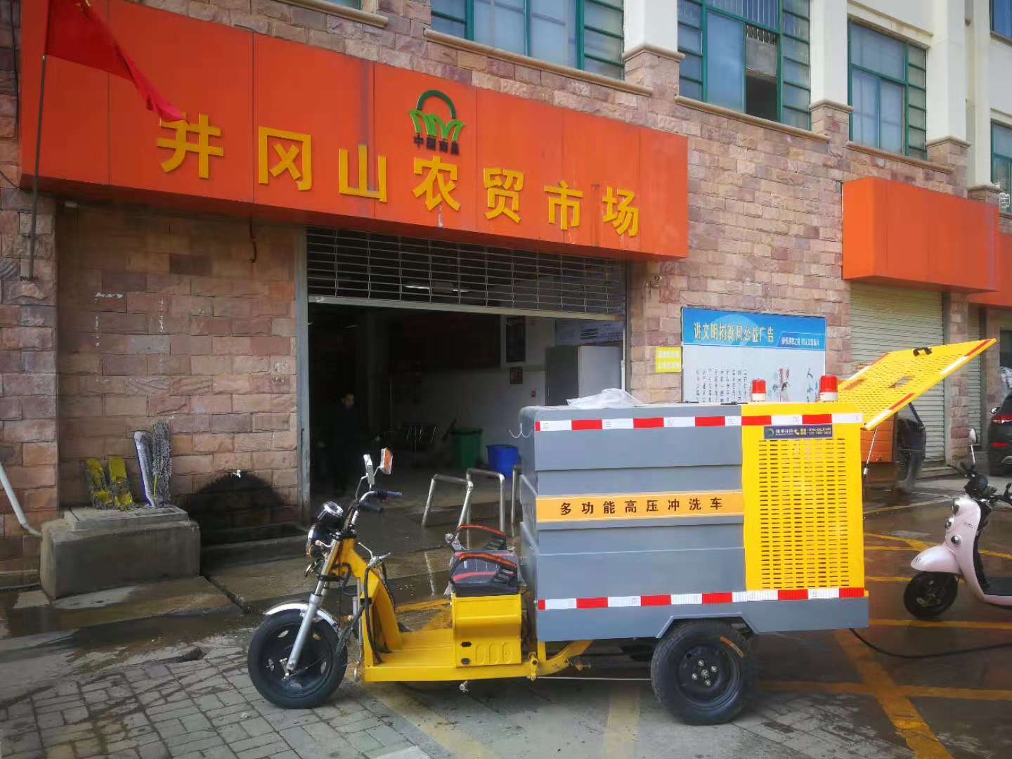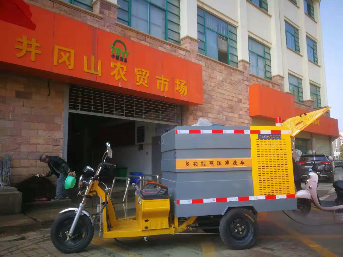 三轮高压冲洗车走进农贸市场这是让人比较意外的。但是想想这又是清理之中的。农贸市场混杂个各种生鲜肉制品,随着人来人往,地面已经脏乱油腻的不成样,如果单独的通过擦洗,各种腥味根本没办法去除,特别是在农贸市场进出口,像这种地方的地面一般都是水泥地面,是粗糙不平的,用洗地机、扫地机的情况也有,但是由于业主对地面的卫生要求不一样,采用三轮高压冲洗车来进行地面冲洗是对地面有更高要求,因为经过高压冲洗后的地面余味残留更少,更洁近,对于农贸市场外围的保洁工作来说更加明了。