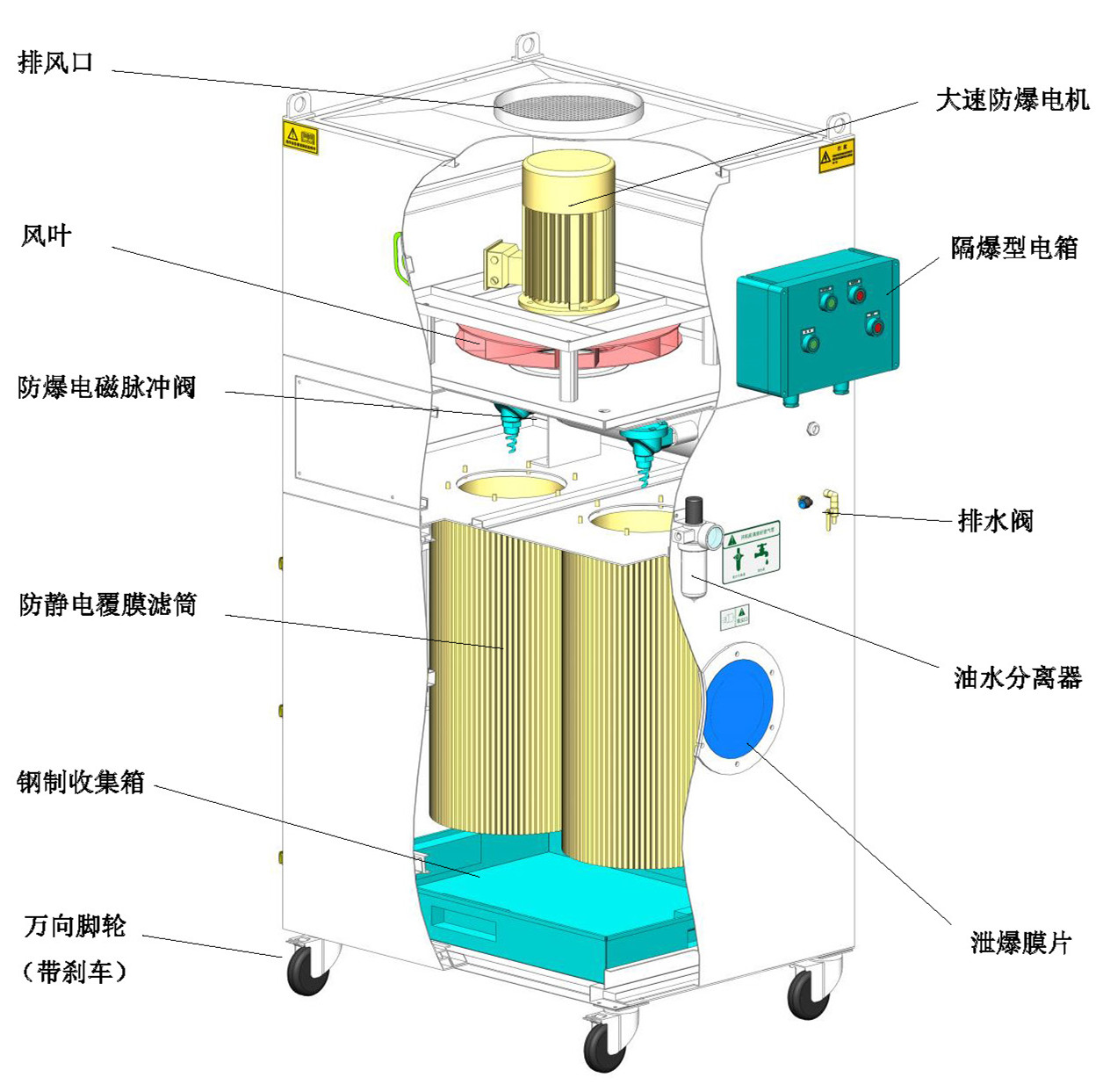 考虑到粉尘的易燃易爆性,特殊配置防静电镀铝型覆膜滤筒,在保证过滤精度的基础上,将导电材料混纺于滤材层中,将需处理的含静电粉尘的静电通过导线导入大地,以达到良好的安全效果。