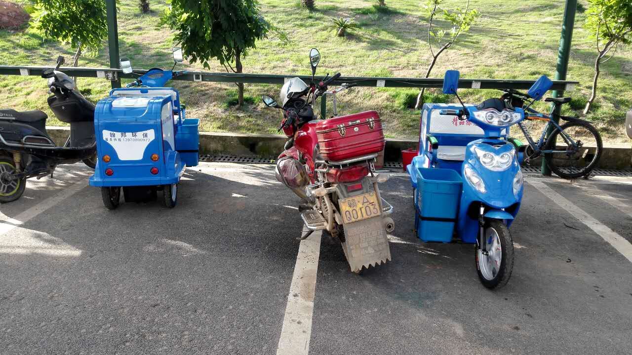 电动三轮保洁车服务于昌北某管理处,蓝白相间的箱体,采用高密度聚乙烯一次注模成型,具有抗打击抗酸碱,耐腐蚀的优良性能,前后轮配置有刹车,保证在行驶作业过程中的安全稳定。这款快速分类保洁车的特殊之处在于可以分拣垃圾,后箱配置垃圾桶,旁边也配置了垃圾小桶,方便随时作业。