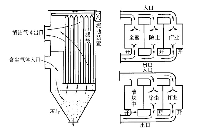 机械振动式和反吹风式清灰属于间歇清灰,即把除尘器分成若干过滤室,逐室切断气路依次清灰,这种方法在清灰过程中无粉尘外逸,可以获得较高的除尘效率。