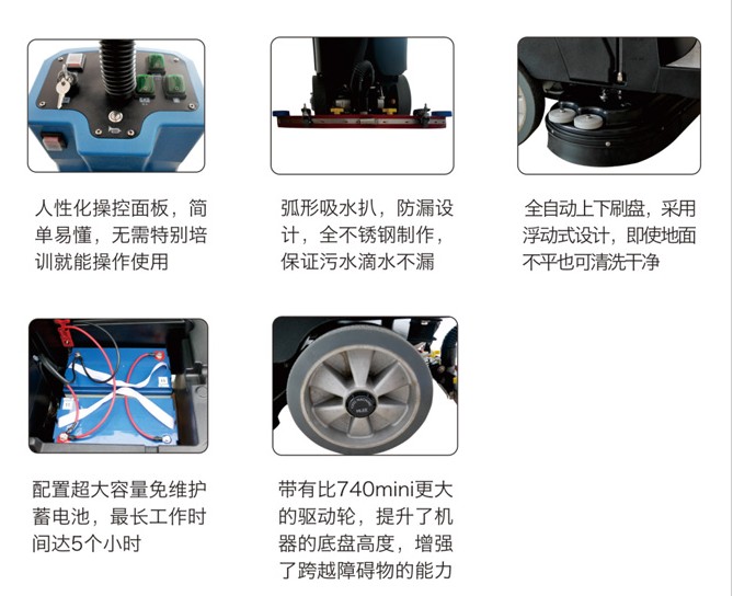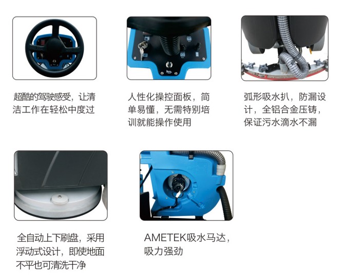驾驶式洗地机的主要构件由4大部分构成,机身、电机、刷盘、吸扒等4大件,驾驶式洗地机的效率很大一部分就是由刷盘的直径、吸扒的宽度、电机的强劲来左右。我们重点推荐的这款双刷驾驶式洗地机重点设计了超大刷盘,加宽了吸水扒,在原有的物业洗地机740的基础上做了升级,让驾驶式洗地机的效率更加强大,让客户的钱花的物超所值。