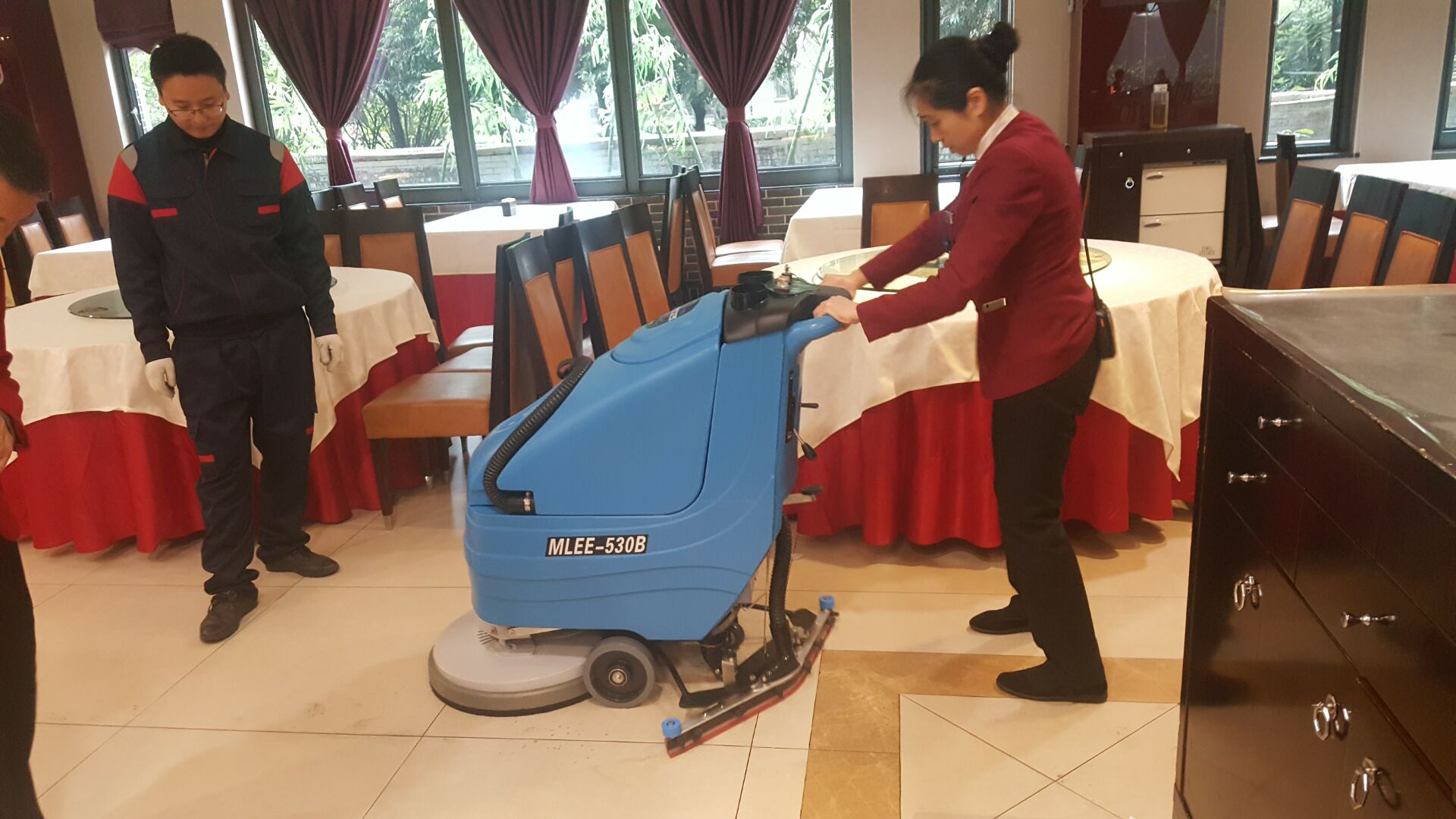 南昌手推式洗地机MLEE-530B自动洗地机是一款由电瓶驱动的自动清洁设备,执行严格的无噪音污染标准,配合使用专业的刷盘,工作十分安静。这款洗地机针对狭小、拥挤或不规则的区域的日常清洁工作而设计,工作时灵活轻便,并有着非常彻底的清洁效果。因此非常适合学校、医院、超市、车站、科研机构以及养老院等场所的使用,而今天,530B又走进了红杏酒家,在使用范围上又有了进一步的突破。