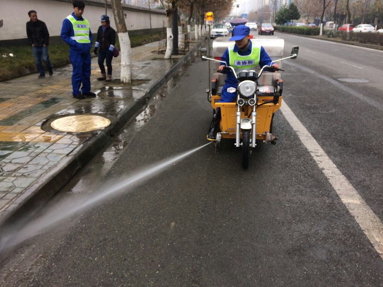高压冲洗车走上街道,浩浩荡荡,好气派。高压冲洗车冲洗整个路面,将地面的泥土灰尘清洗干净,将大体积垃圾冲洗到一堆,再经过电动扫地车过一遍,整体完美。