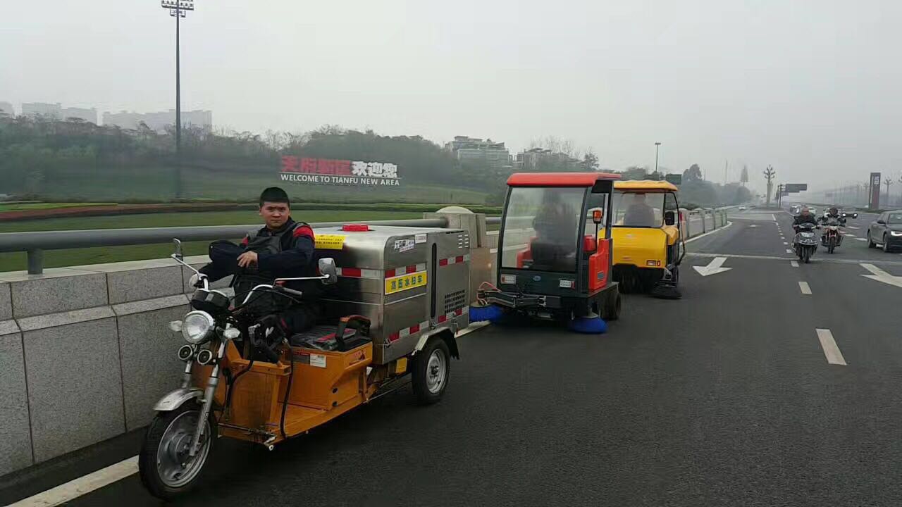 高压水扫车与电动扫地车的组合,比任何一种其他方式的组合都要高效。这是由于高压水扫车与电动扫地车本身性能的互补性所决定的。高压水扫车利用扇形、水柱形水冲刷地面,前置及侧面都配有水扫装置,能够快速的洗扫地面,将地面的灰尘泥土冲刷干净,将大的垃圾收集到一堆。电动扫地车在高压水扫车经过之后将堆积的垃圾扫除,快速高效,比单独使用某一种清洗清扫设备效率更高。