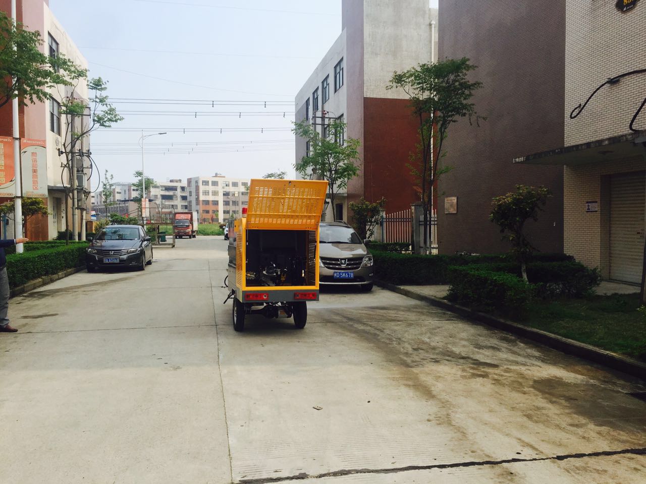 贴上一段试机视频,以及小型高压冲洗车现场试机效果图。