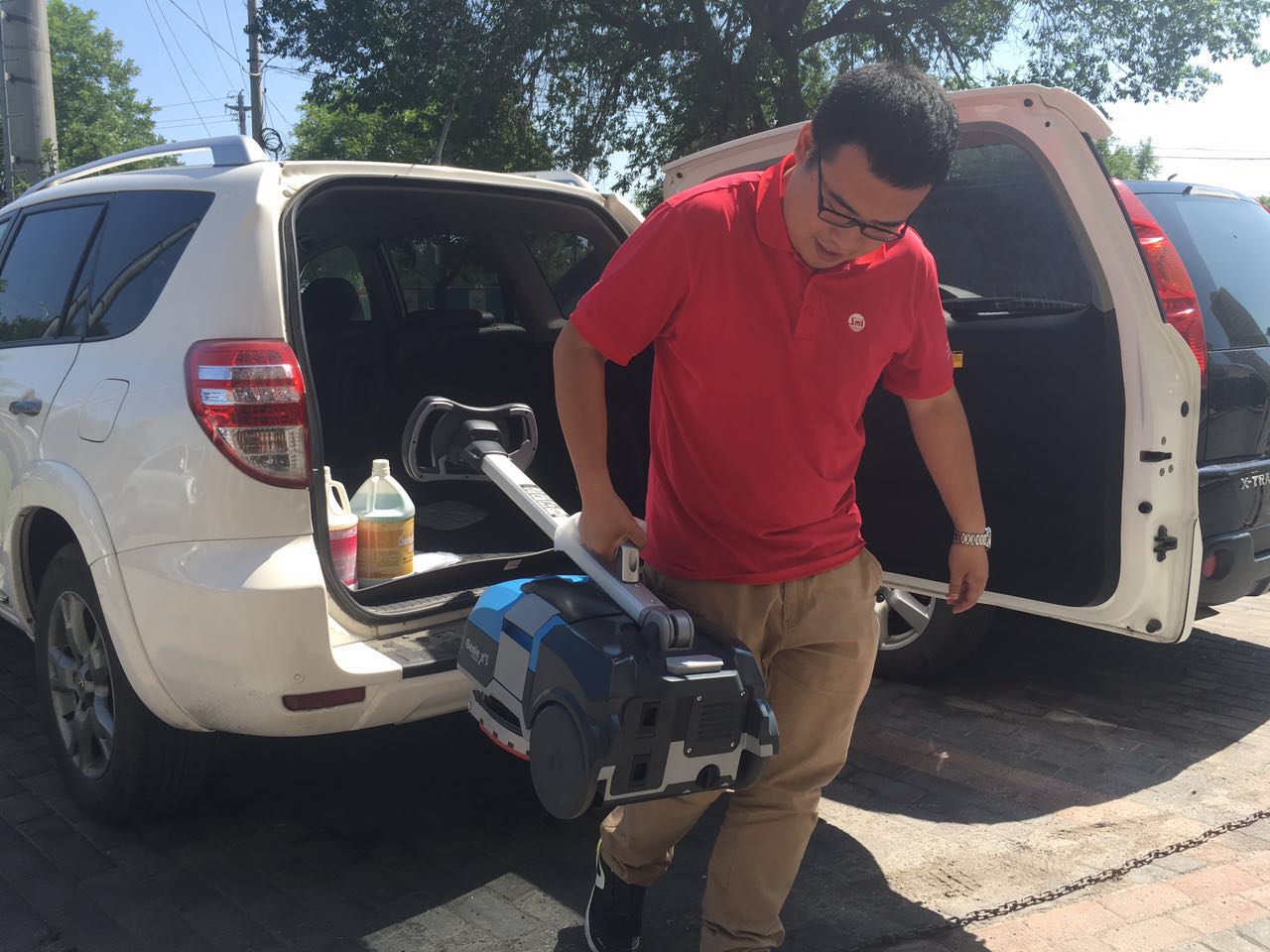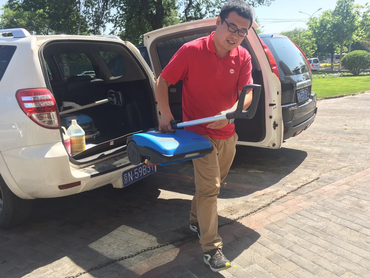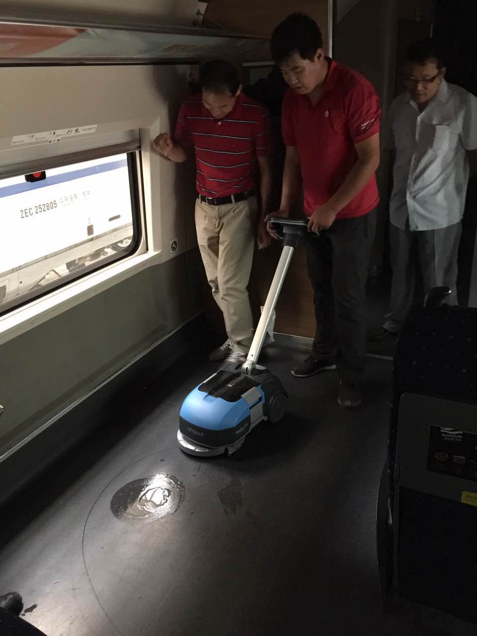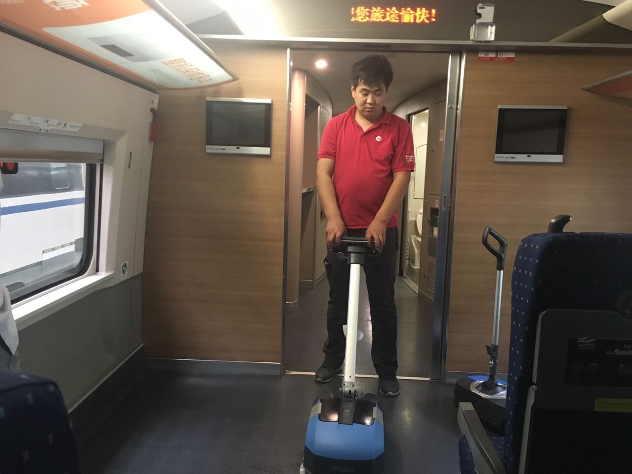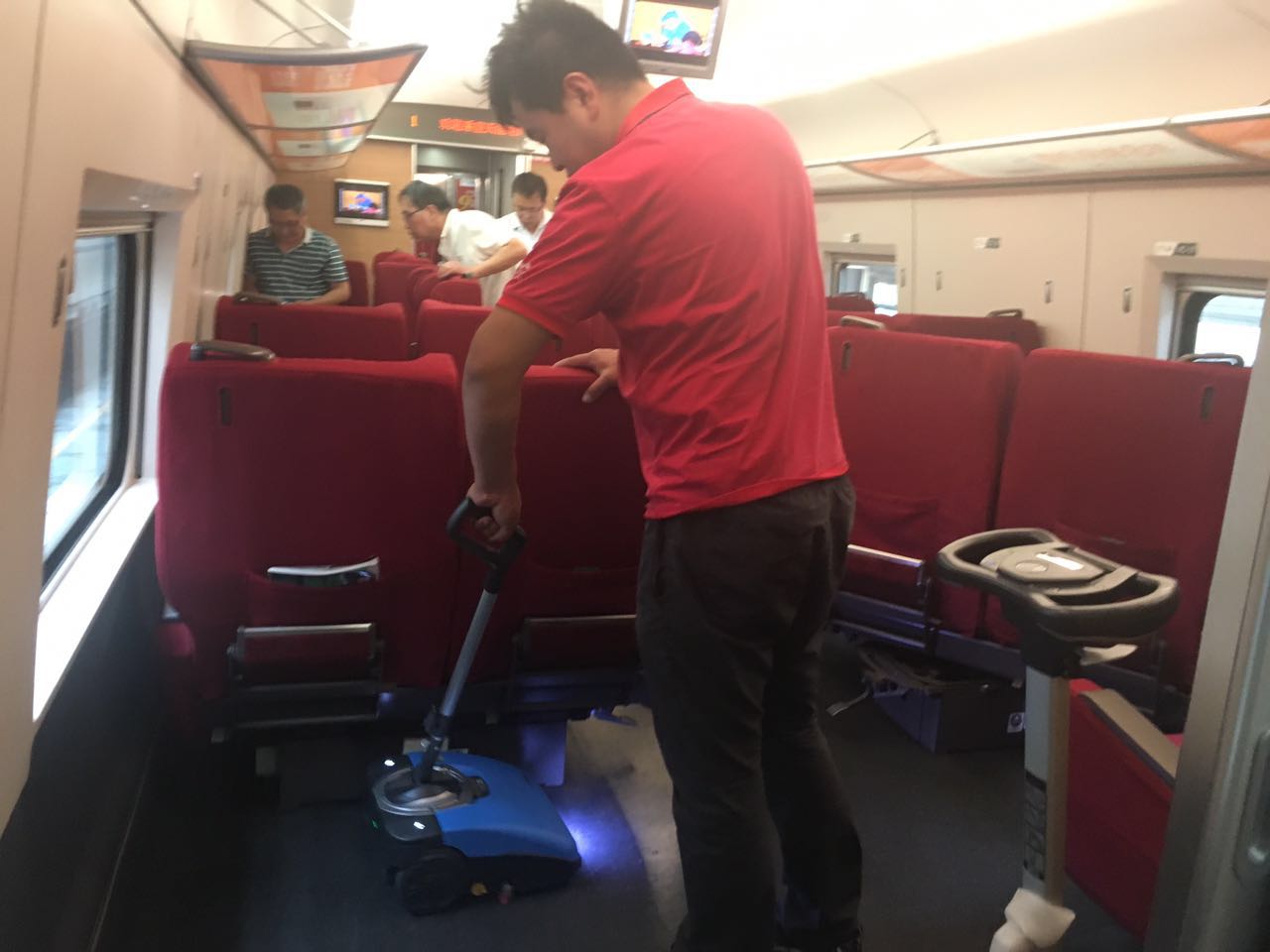 我们绝大多数人都坐过高铁,大致了解到高铁车厢的客观条件,高铁车厢内的整齐排放的座位对于洗地机而言是一个比较大的限制条件,存在的障碍物多。另外一方面就是高铁动车组的车厢一般都由多节车厢组成,常见的有16节,算起来这个清洁的工作量还是挺大的,普通的难以快速灵活的操作,一是在清洁效果上达不到要求,二是在清洁效率上得不到很好的展现,我们使用洗地机的本意就是要提高清洁效率,如果不能展现这一优势,这恰恰是与我们的初衷相悖的。我所见过的高铁清洁模式,是除了高铁在行车过程中保洁员对其进行清洁,在到达终点站时,再统一对高铁车厢整体的打扫,并且在列车到达终点站与下一列次出发的时间的间隔是很短的,这就意味着保洁员需要在短的时间内将车厢打扫干净,可想而知,这个工作需要多高的效率才能完成或者是说需要多少个保洁员才能完成这项工作,才能保证高铁的高大形象。