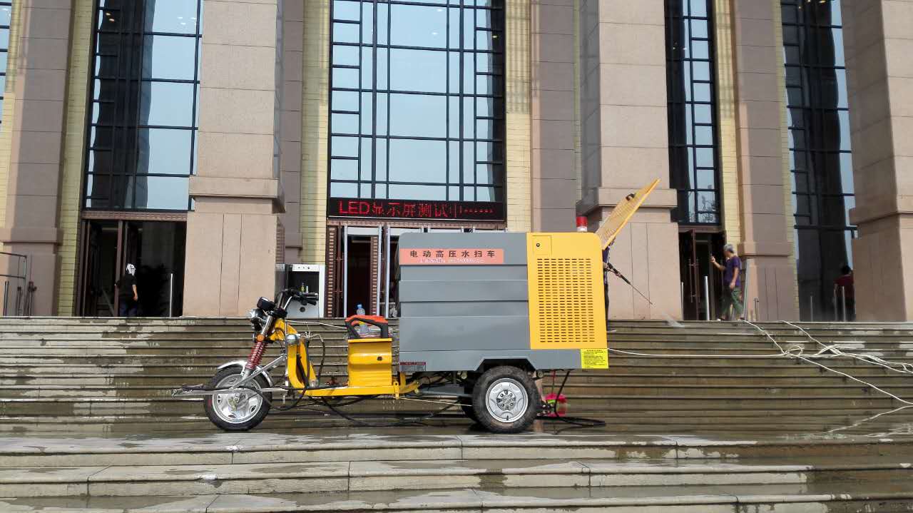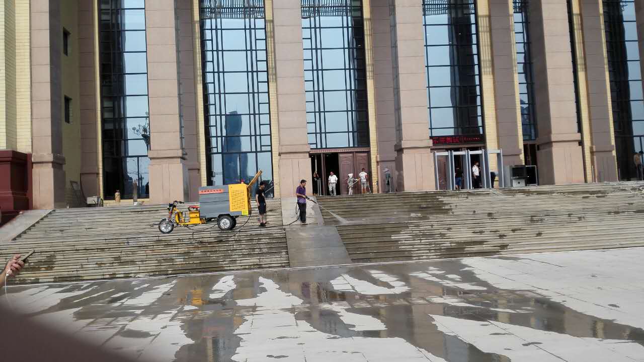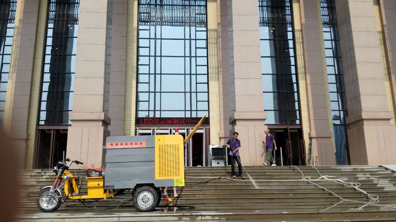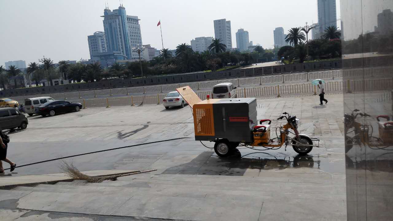 2、八一广场有众多台阶跟异形面,使用三轮冲洗车的高压清洗原理能做到无清洁死角。